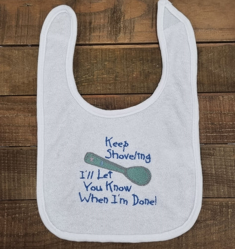 Keep Shoveling I'll Let You Know When I'm Done Bib (white)